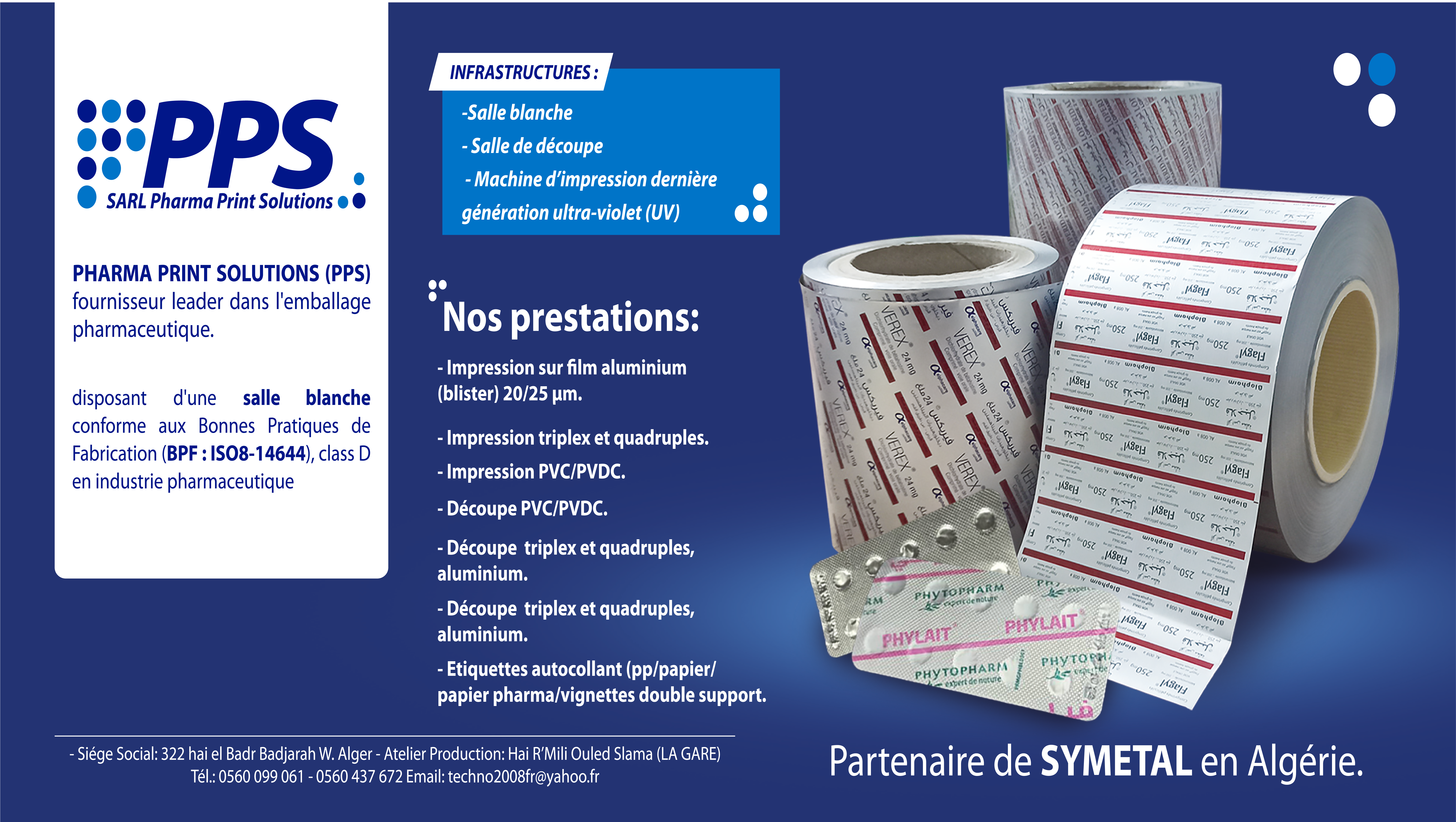 Avec une expertise confirmée, la SARL Pharma Print Solutions se positionne comme un partenaire de référence dans l’impression sur tous supports (aluminium, étiquettes autocollantes, quadriplex, sachets forme poudre et liquide) dédiés au secteur pharmaceutique en Algérie.